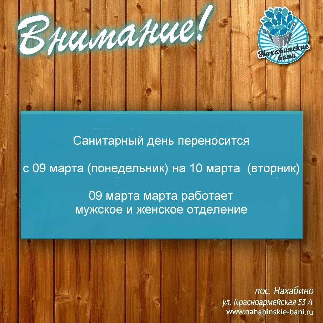 Внимание! Санитарный день 09 марта (понедельник) переносится на 10 марта (вторник) 09 марта работает мужское и женское отделение с 10.00-23.00. Будем ждать вас!